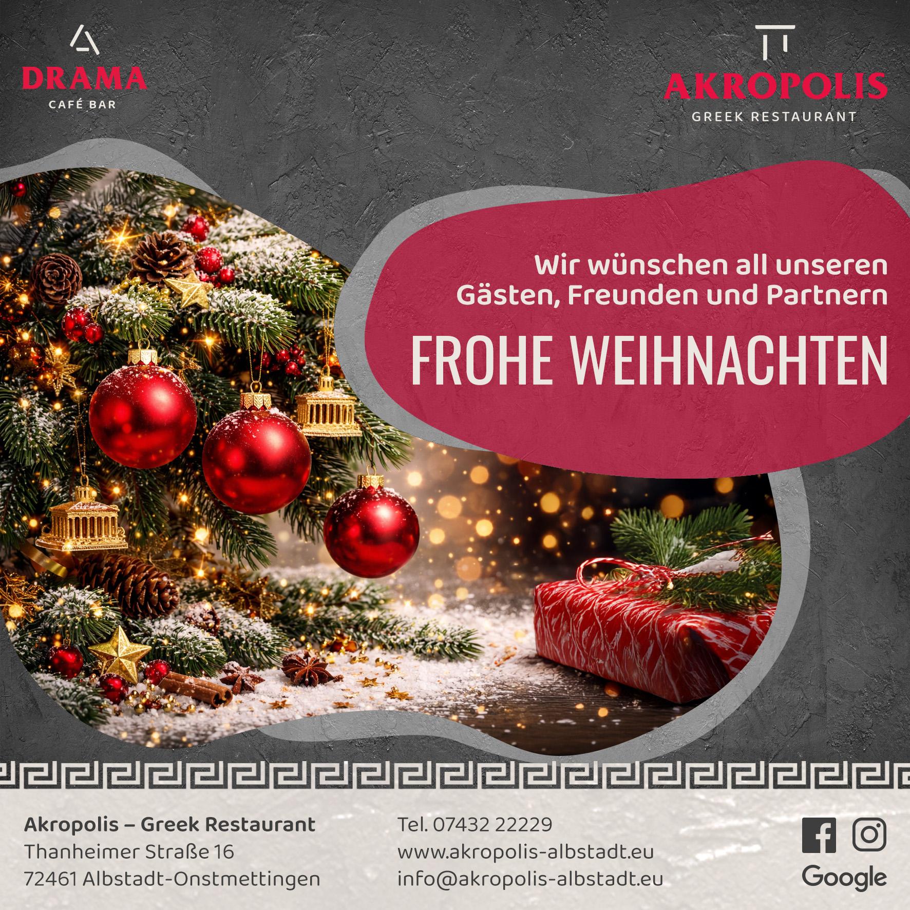 Wir wünschen all unseren Gästen, Freunden und Partnern frohe Weihnachten im Kreise Ihrer Liebsten! Vielen herzlichen Dank für Ihre Treue und Unterstützung in diesem Jahr. Wir freuen uns auf Sie!Ihr Akropolis-Team