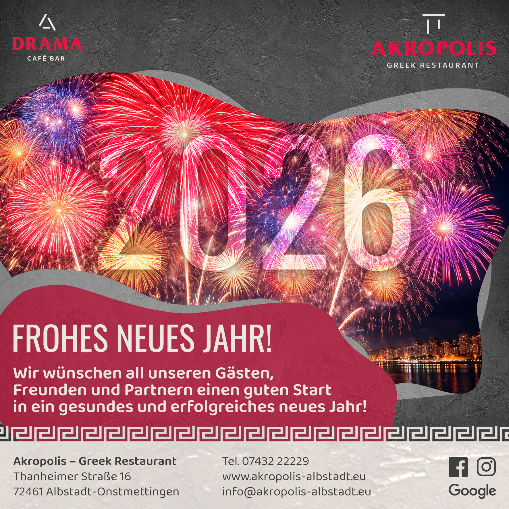 Wir wünschen all unseren Gästen, Freunden und Partnern einen guten Start in ein gesundes und erfolgreiches neues Jahr! Wir bedanken uns bei allen Gästen für Ihre Treue und bei all unseren Partnern für die gute Zusammenarbeit und freuen uns auf Sie in 2026. Ihr Akropolis-Team