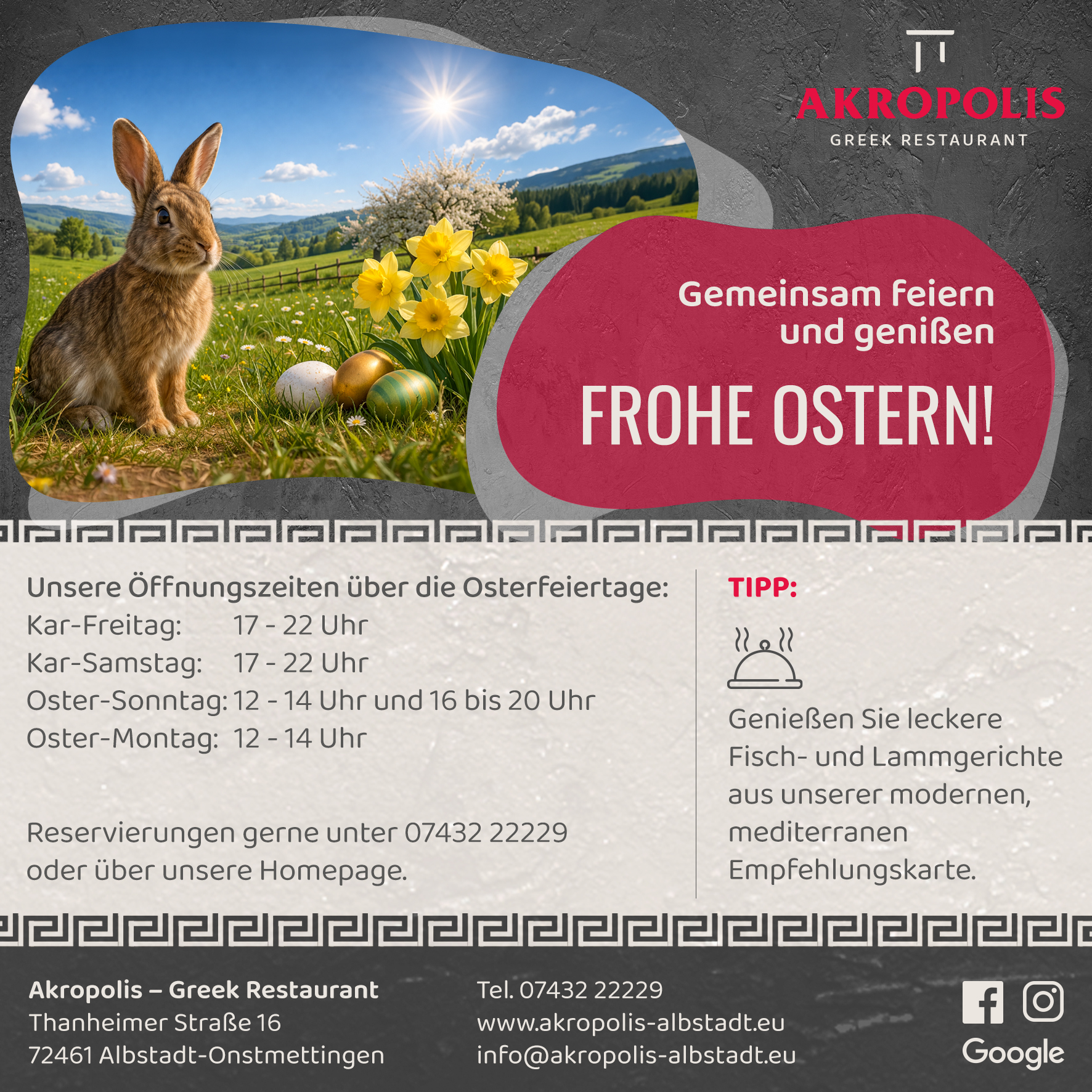 Unsere Öffnungszeiten über die Osterfeiertage:Kar-Freitag: 17 – 22 UhrKar-Samstag: 17 – 22 UhrOster-Sonntag: 12 – 14 Uhr und 16 bis 20 UhrOster-Montag: 12 – 14 Uhr Reservierungen gerne unter 07432 22229 oder über unsere Homepage. TIPP:Genießen Sie leckere Fisch- und Lammgerichte aus unserer modernen, mediterranen Empfehlungskarte.