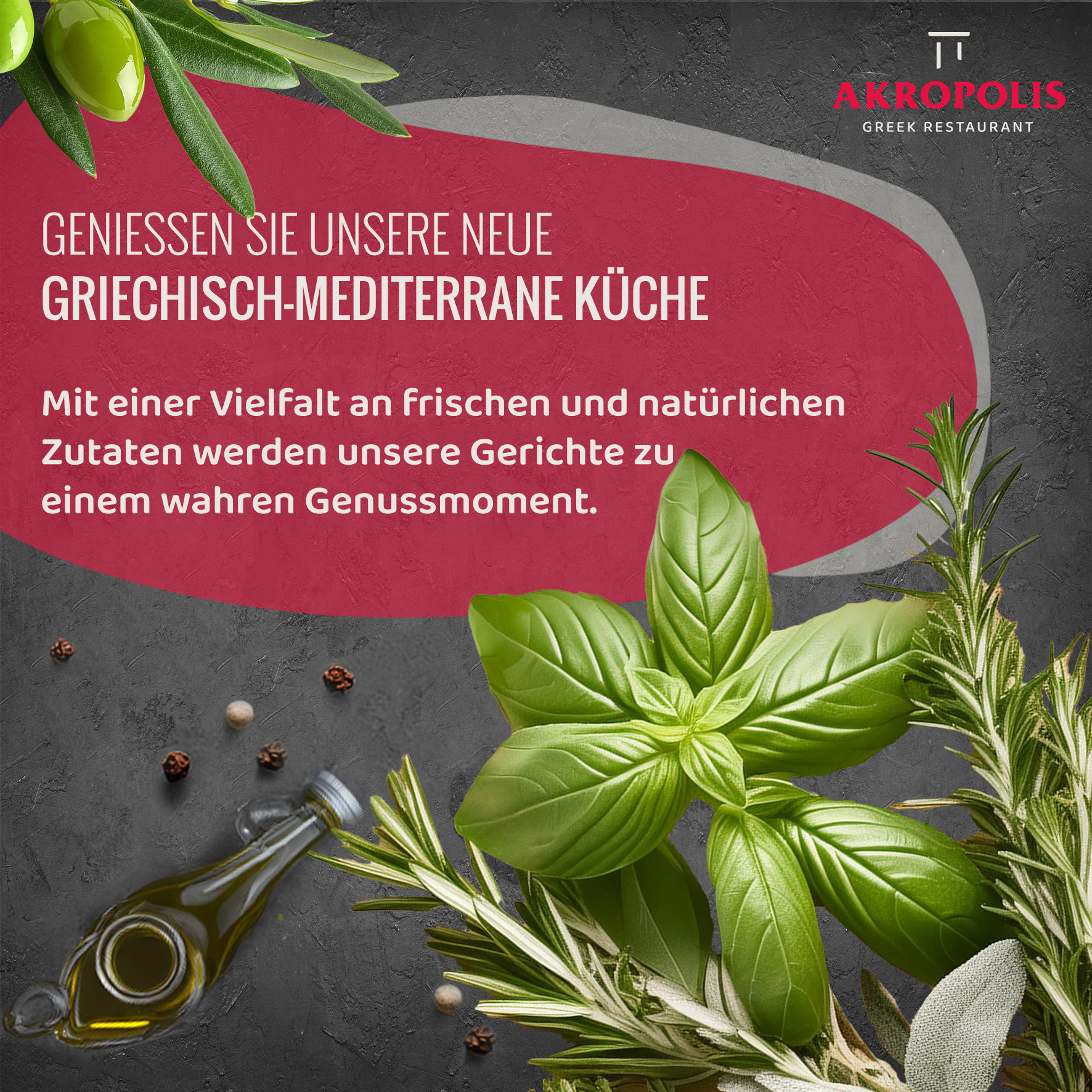 Genießen Sie unsere neue griechisch-mediterrane Küche. Mit einer Vielfalt an frischen und natürlichen Zutaten werden unsere Gerichte zu einem wahren Genussmoment. Reservieren Sie einen Tisch und erleben Sie mediterrante Küche mit ausgewählten Zutaten, prachtvoll angerichtet, ganz neu! Wir freuen uns auf Sie!Ihr Akropolis Team